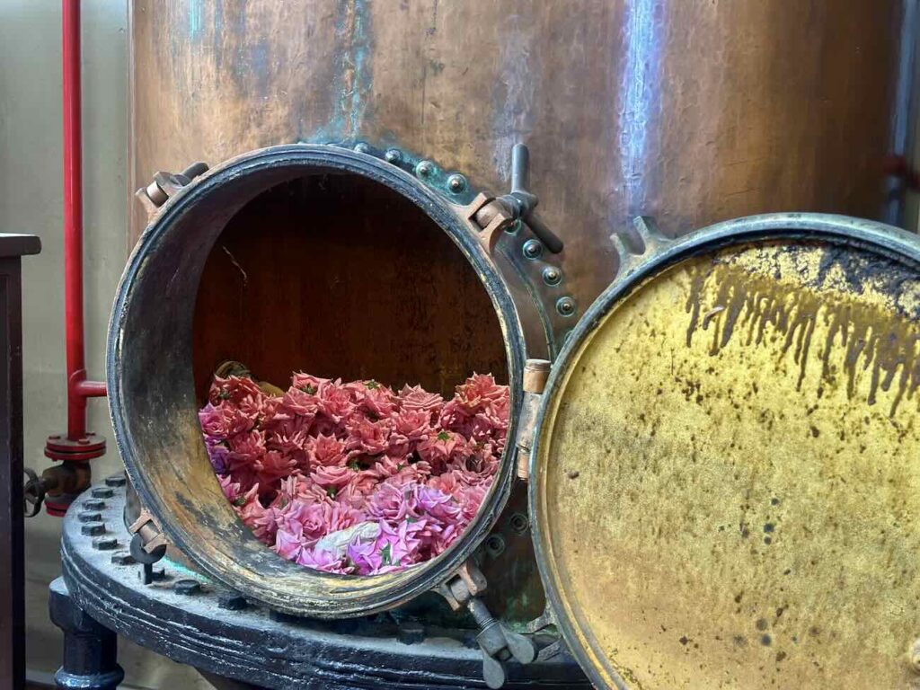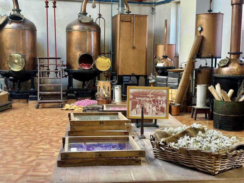 La visite rappelle d’abord les origines grassoises de la parfumerie. À l’époque où la ville était dominée par les tanneries, les champs de fleurs – jasmin, rose, violette – étaient cultivés pour masquer les odeurs des peaux.